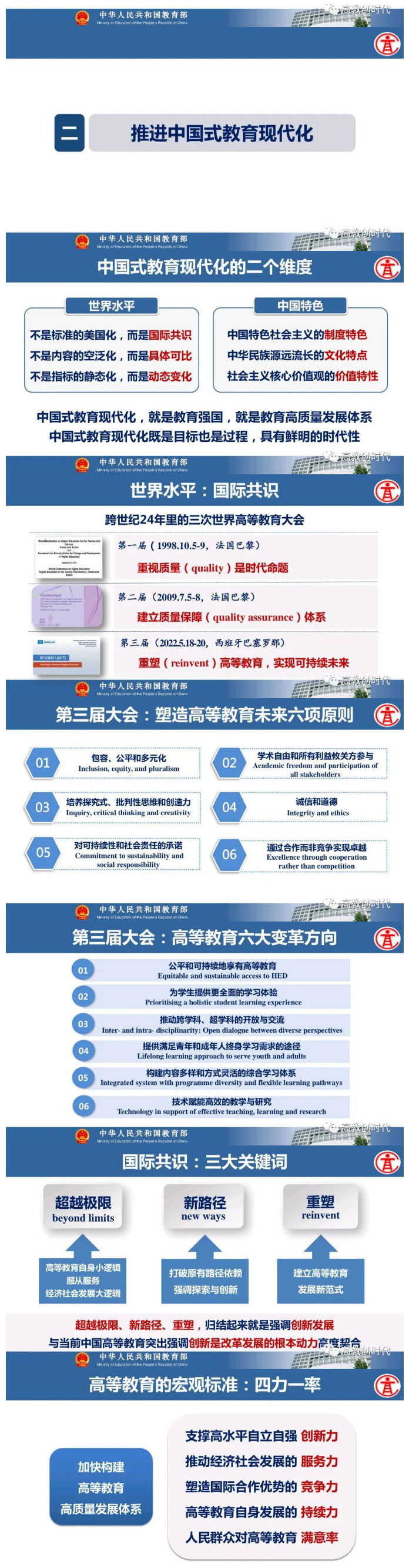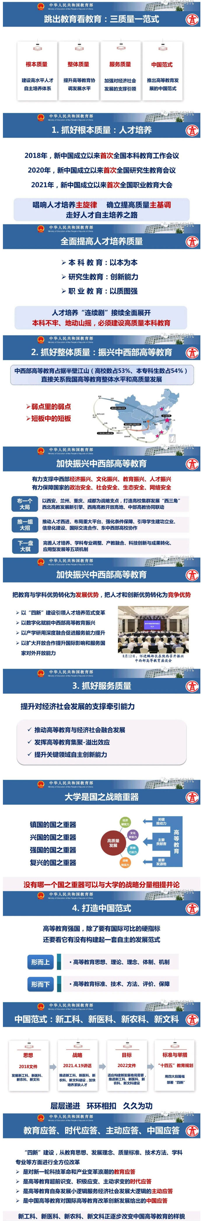 吴岩指出,构建高质量的高等教育体系,必须提高支撑高水平自立自强的创新力、推动经济社会发展的服务力、塑造国际合作优势的竞争力、高等教育自身发展的持续力、人民群众对高等教育的满意率,要跳出教育看教育,抓好三质量、打造一范式,抓好根本质量、建设高水平人才自主培养体系,抓好整体质量、提升高等教育协调发展水平,抓好服务质量、加强对经济社会发展的支撑引领,推出高等教育发展的中国范式。