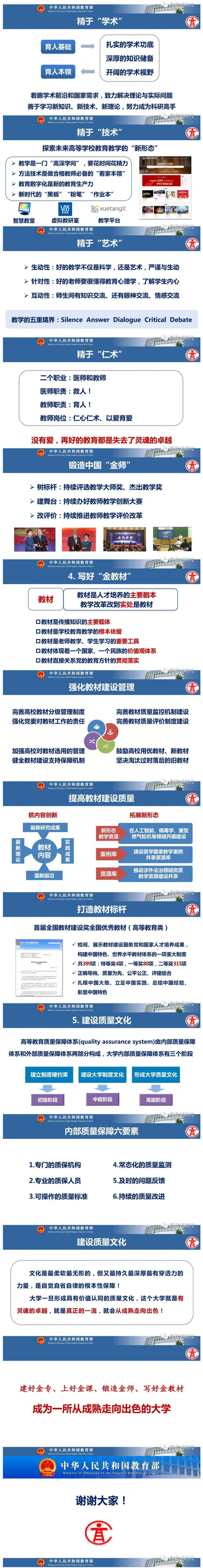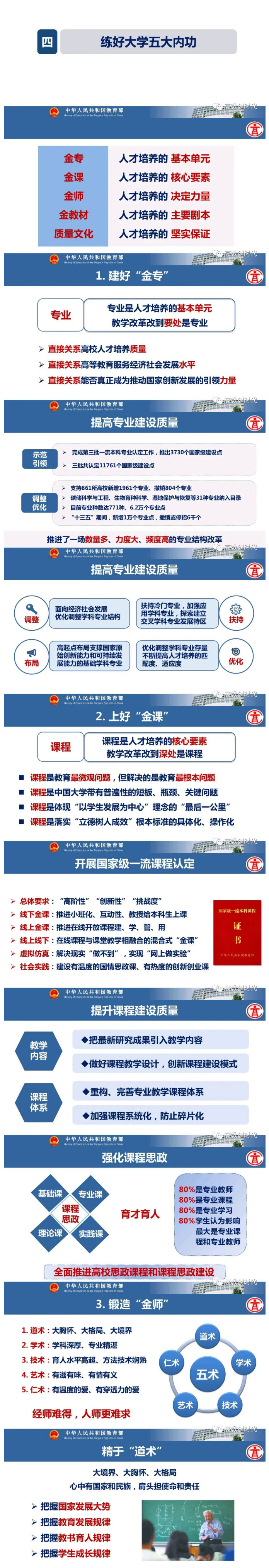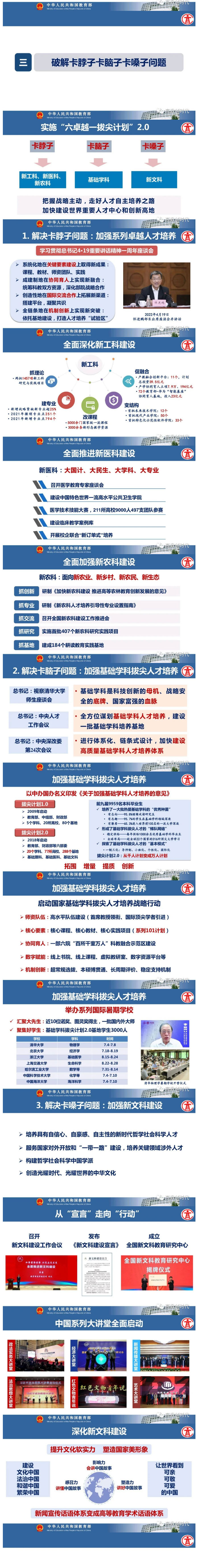 吴岩强调,高等教育强国除了要有国际可比的硬指标,还要看它有没有构建起一套自主的发展范式。要着力破解卡脖子卡脑子卡嗓子问题,通过实施“六卓越一拔尖计划”2.0(新工科、新医科、新农科),破解卡脖子问题;通过加强基础学科拔尖人才培养,破解卡脑子问题;通过深化新文科建设,破解卡嗓子问题。根本上是要练好大学五大内功(金专、金课、金师、金教材、质量文化)。