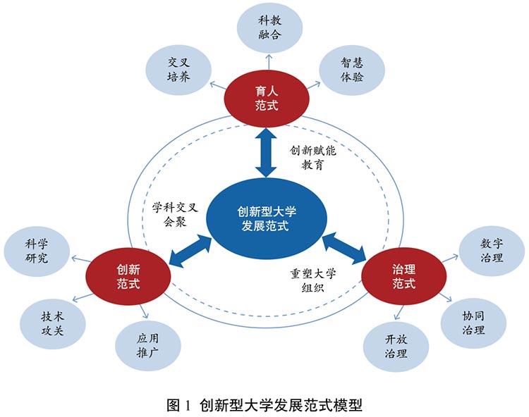 19世纪的德国产生了研究型大学,20世纪的美国出现了创新型大学的雏形,引领了世界高等教育的发展潮流。进入21世纪,第四次工业革命的纵深发展,带来了社会生产力的大解放和发展驱动力的大跃升,推动现代大学的范式创新和系统重塑,促进高水平研究型大学加速向创新型大学演变。21世纪的创新型大学将响应时代变化,以范式迭代引领现代大学的改革发展,突出体现育人范式、创新范式、治理范式的变革(如图1所示)。