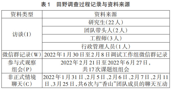 课题组于2022年1月30日至2月8日参与式观察“香山-雁栖湖”芯片的攻关调试工作,加入调试工作组微信群,于2022年2月至6月每周一次参与式观察“香山”团队课题组组会,以半结构化形式深入访谈“香山”团队的硕博研究生共22人(其中14位为博士研究生,4位为硕士研究生,4位为已保研的本科生),团队带头人、工程师以及行政管理人员共6人,同时对非正式情境下与“香山”团队成员的聊天互动作详细的田野笔记。(见表1)