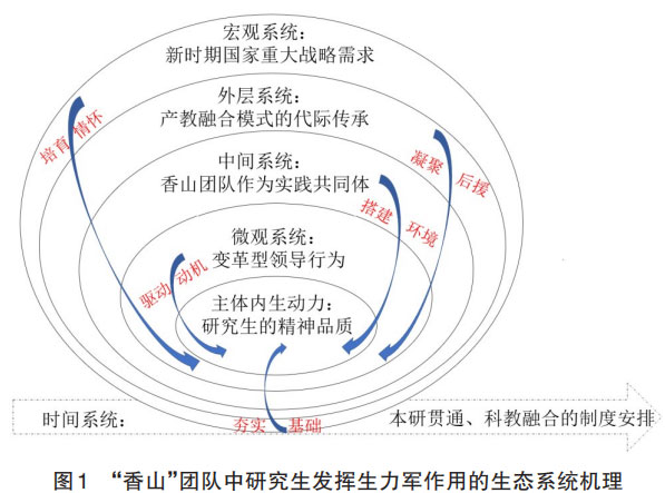 摘 要:研究生教育是教育、科技、人才的结合点。以“香山”技术攻关团队为研究对象,通过对大量一手实证资料的分析发现,研究生在核心技术攻关中发挥生力军作用的机理,呈现出外部环境与个体发展之间复杂的互动关系,呼应了生态系统理论:研究生的精神品质是其发挥生力军作用的内生动力;变革型领导行为所形成的微观系统,激发研究生的主体活力;“香山”团队作为中间系统,为研究生搭建了良好的实践环境;产教融合代际传承所形成的外层系统,凝聚起研究生敢闯能拼的技术后援;国家战略需求所形成的宏观系统,唤起研究生的家国情怀;本研贯通、科教融合所形成的时间系统,夯实了研究生的知识与能力基础。