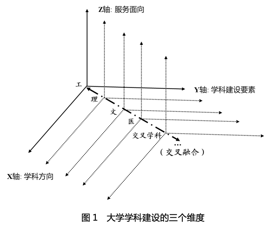x轴是学科方向。以大学一级学科为例,x轴是一级学科下所设的学科方向,如机械学科是一个一级学科,机械设计及理论、机械制造及其自动化、车辆工程、机械电子工程就属于二级学科方向。我们加强一级学科建设,鼓励在一级学科下自主设置新的学科方向。例如,在机械设计方面,围绕加强数字化设计能力,在人才培养、科技创新中就要强调数字化元素;在机械制造方面提出了智能制造,就是在传统制造学科中注入智能的元素;机械电子工程也是比较典型的二级交叉学科,这从名称就能看出来。我们要做的不仅是把新的领域、新的方向从传统学科中抽出来组建新的学科,重点还要鼓励在一级学科下多设交叉方向,在传统学科方向上多注入数字化、智能化等新元素。大学应当注重一级学科各学科方向间交叉融合,这其中的逻辑需要我们深入去挖掘。