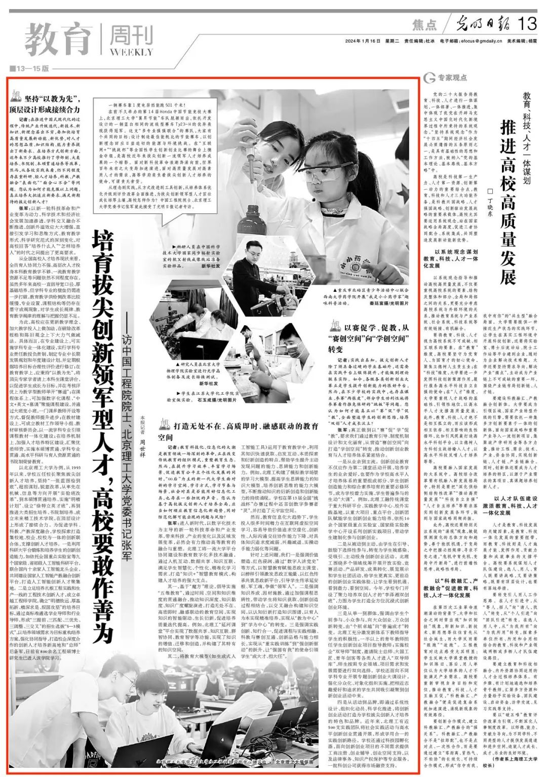 以北京理工大学为例,从1993年以来,学校五任校长聚焦拔尖创新人才培养,坚持“一张蓝图绘到底”,超前谋划,锐意改革,从率先在机械、信息等方向开展“实验班改革”,到本硕博贯通培养、实施“明精计划”、设立“徐特立英才班”,再到推进大类招生培养、书院制培养、成立未来精工技术学院,在顶层设计上形成了接续合力。为促进学科、科教、产教深度融合,学校探索打造集校地、校企、校校为一体的创新联合体,支撑创新人才培养。一是利用科研大平台锻炼和培养学生的创新创造能力,如依托全国重点实验室等九个国家级、省部级人工智能科研平台,联合国内十余家人工智能龙头企业,共同建设国家人工智能产教融合创新平台,打造人工智能创新人才聚集地。二是立足培养扎根工程实践和生产一线的工程技术创新人才,成立卓越工程师学院,确立“明德致远、厚基拓新、精深求是、报国攻坚”的培养目标,通过高标准遴选学业导师和行业导师,形成“三提前、三匹配、三优先、三调整、三交叉”的招生选拔“5—3模式”,以培养领域需求为目标重构培养方案,强化协同指导,打造校企深度合作的创新人才培养新高地和“总师”后备军,目前有800余名工程硕博士研究生已进入该学院学习。