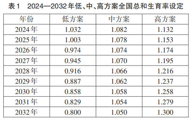 本研究选择“七普”数据中分性别、分年龄人口数作为基期人口准备数据,然后据此设定2024—2032年全国人口的生育水平及其模式、死亡水平及其模式、出生性别比、城镇化率和迁移水平及其模式等关键参数,研究数据口径均为常住人口。