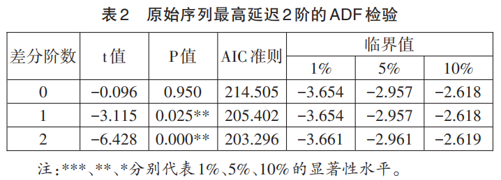 1. 平稳性检验。检验方法主要有两类:一是根据时序图和样本acf、pacf图进行判断的图检验法;二是构造检验统计量进行假设检验的df检验法。由于图检验法具有较强的主观性,因此本研究采用adf检验(augmented dickey-fuller)。结果显示,(见表2)1990—2023年普通本专科招生规模原始序列在差分为0阶时,显著性p值大于0.05,不呈现显著性,说明该序列为非平稳序列;在差分为1阶和2阶时,显著性p值小于0.05,呈现显著性,说明该序列为平稳序列。因此,对原始非平稳序列只需进行1阶差分就可以实现平稳。