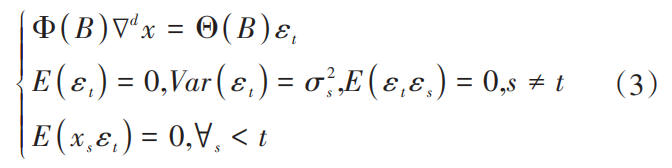 时间序列分析法是指从序列值之间的依存关系中探寻出序列发展变化的规律,并通过拟合适当的数学模型描述这种变化规律,进而利用该模型对序列的未来值进行预测。该方法经常使用的模型是arma模型家族,包括ar模型、ma模型和arma模型。1970年,美国统计学家g.e.p.box和英国统计学家g.m.jenkins在arma模型基础上提出了求和自回归移动平均模型,简记为arima(p,d,q)。其中p为自回归系数,表示序列值滞后p阶;d表示原始序列变为平稳序列需要至少差分d次;q为滑动平均系数,表示误差项滞后q阶。数学表达式为: