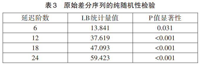 2. 纯随机性检验。在统计学意义上,纯随机序列是没有任何分析价值的序列,即过去的行为对将来的发展没有丝毫影响。为此在预测之前,需要进行纯随机性检验。结果显示,(见表3)各阶延迟下lb统计量的p值都显著小于0.05,所以认为该序列为非白噪声序列。因此,预处理后的原始1阶差分序列为平稳非白噪声序列,具有良好的分析价值,可以使用arma模型进行拟合。
