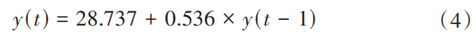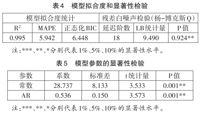 2. 模型检验。在确定模型形式和参数口径后,需要进行模型检验。一是模型的拟合度检验,表4显示模型决定系数r2=0.995,接近于1,说明模型拟合数据的准确度较高;二是模型的显著性检验,模型延迟18阶下lb统计量的p值=9.490>0.05,所以该模型的残差序列为白噪声序列,说明序列中的有效信息已经基本被模型提取,即拟合模型显著有效;三是参数的显著性检验,表5显示ar参数的t统计量的p值=0.001<0.05,说明参数在95%的置信区间内显著非零,即参数显著有效。综上所述,arima(1,1,0)模型的拟合效果显著成立且质量较好,可用于后续序列预测。