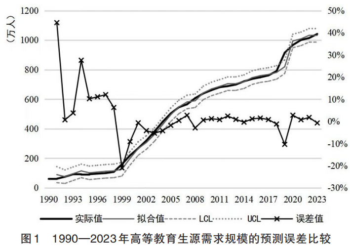 预测误差检验是指通过对比预测结果与预测对象发展变化的真实结果的差距,预测误差越小,说明预测越准确。根据平均绝对百分比误差(mean absolute percentage error)的标准,当误差值小于10%为高精度预测,处于10%~20%为良好预测,处于20%~30%为可行预测,大于50%为错误预测。本研究将arima(1,1,0)模型拟合的1990—2023年普通本专科招生规模预测值与教育部已正式公布的实际值进行比较后发现,(见图1)除了1991年和1994年预测误差值大于20%以外,其余各年份都低于12%,其中高精度预测占85%、良好预测占9%、可行预测占6%。因此,本研究的模型预测误差对观测值的影响相对较小,预测结果的准确度较高。