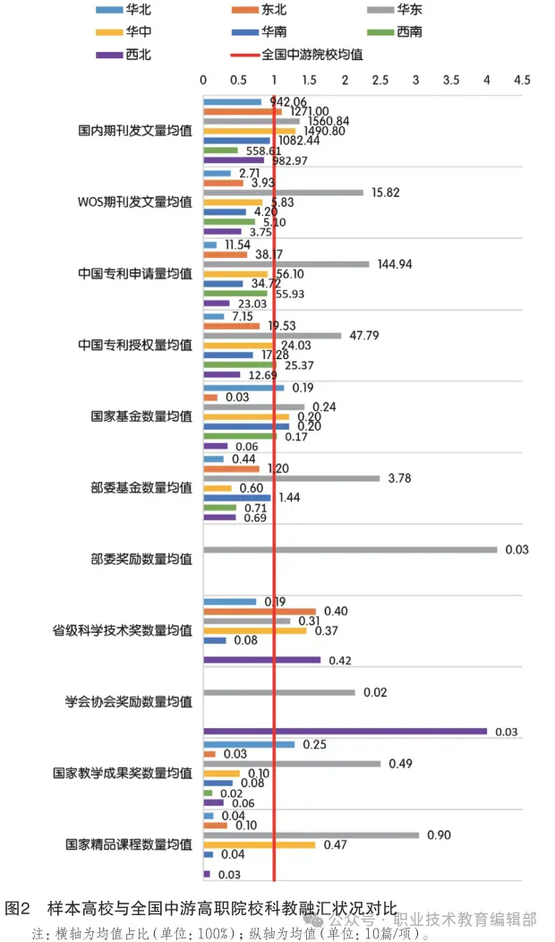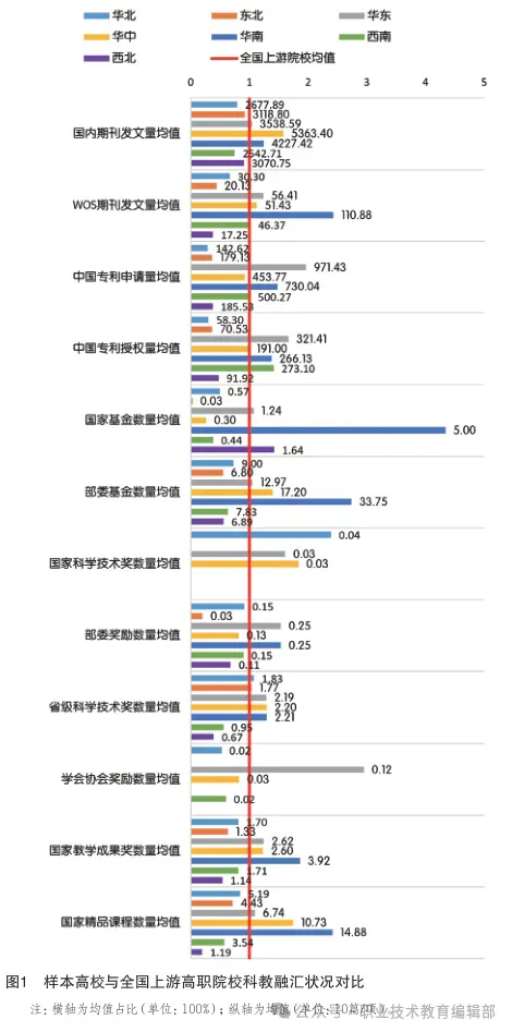 在样本高校与全国上游高职院校科研发展状况对比指标中,华东和华南地区实力最强,东北与西北地区优势指标最少,这表明产业成熟地区的科教融汇成果突出。样本高校与全国上游高职院校科研发展状况对比见图1。