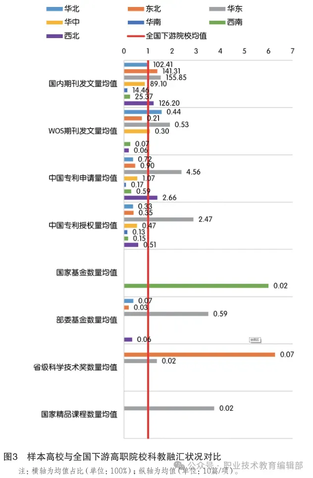 在样本高校与全国中游高职院校科研发展状况指标对比中,华东和华中地区实力最强,华北、西北、东北地区各指标大体相当,华南地区优势指标最少,由此可见,区域间、区域内科技资源分配影响科教融汇整体效果。样本高校与全国中游高职院校科研发展状况对比情况见图2。