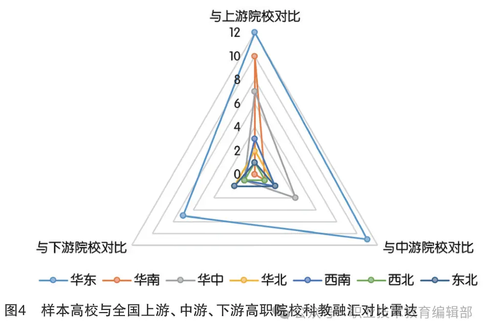 从图4看出,处于雷达外围的华东地区在各个层次的院校对比中均占据绝对优势,而且形状规则,证明华东地区高职院校科教融汇总体效果位居全国前列,并且上游高职院校、中游高职院校和下游高职院校科教融汇发展均衡,每个层次院校的科教融汇在全国均具有竞争力。