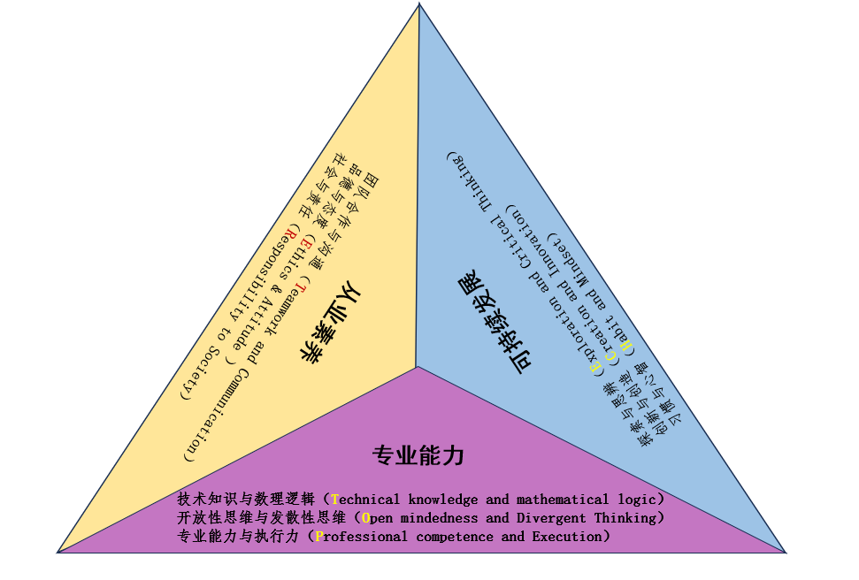 信息文明时代,我们应该构建了专业能力、从业素养和可持续发展“三棱锥”图谱,围绕知识探索、能力建设、人格塑造三要素构建“toptecher”核心能力模型。“三棱锥”中的专业能力主要包含以下三个指标:技术知识与数理逻辑(technical knowledge and mathematical logic),开放性思维与发散性思维(open mindedness and divergent thinking),专业能力与执行力(professional competence and execution);在从业素养中,我们应该更加强调了学生与社会的沟通能力以及对社会的责任,从业素养包含了以下三个指标:团队合作和沟通(teamwork and communication),品德与态度(ethics and attitude),社会与责任(responsibility to society);可持续发展能力包含了以下三个指标:探索与思辨(exploration and critic thinking), 创新与创造(creation and innovation),习惯与心智(habit and mindset)。在“三棱锥”模型中,专业能力为基础,筑牢事业发展的根基,从业素养为保障,规范职业行为的准则,可持续发展是关键,开启未来职场的通途。三者相互促进,相互影响,共同推动高等教育供给侧从“学业”认同向“就业”认同转变,从“学历”认同向“能力”认同转变,从“成长”认同向“成才”认同转变。