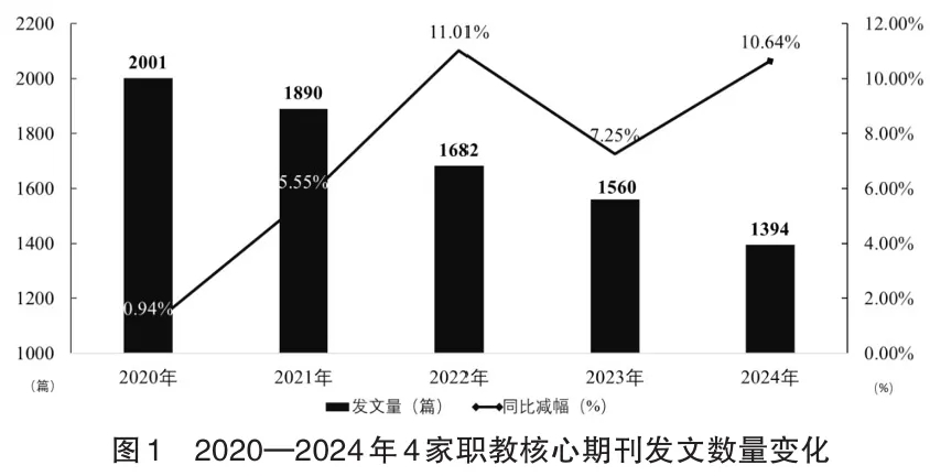 2024年4家职教核心期刊共发文1394篇,与2023年相比刊文数量有较为明显的下降。2020—2024年5年间,刊文总量呈现持续下降的态势。(见图1)刊文数量的变化一定程度上显示了期刊在优化办刊方向、提升办刊质量、助力学术繁荣上的努力,但也反映出职业教育科研队伍不断扩大与核心期刊平台的学术生产承载力下降之间的矛盾。