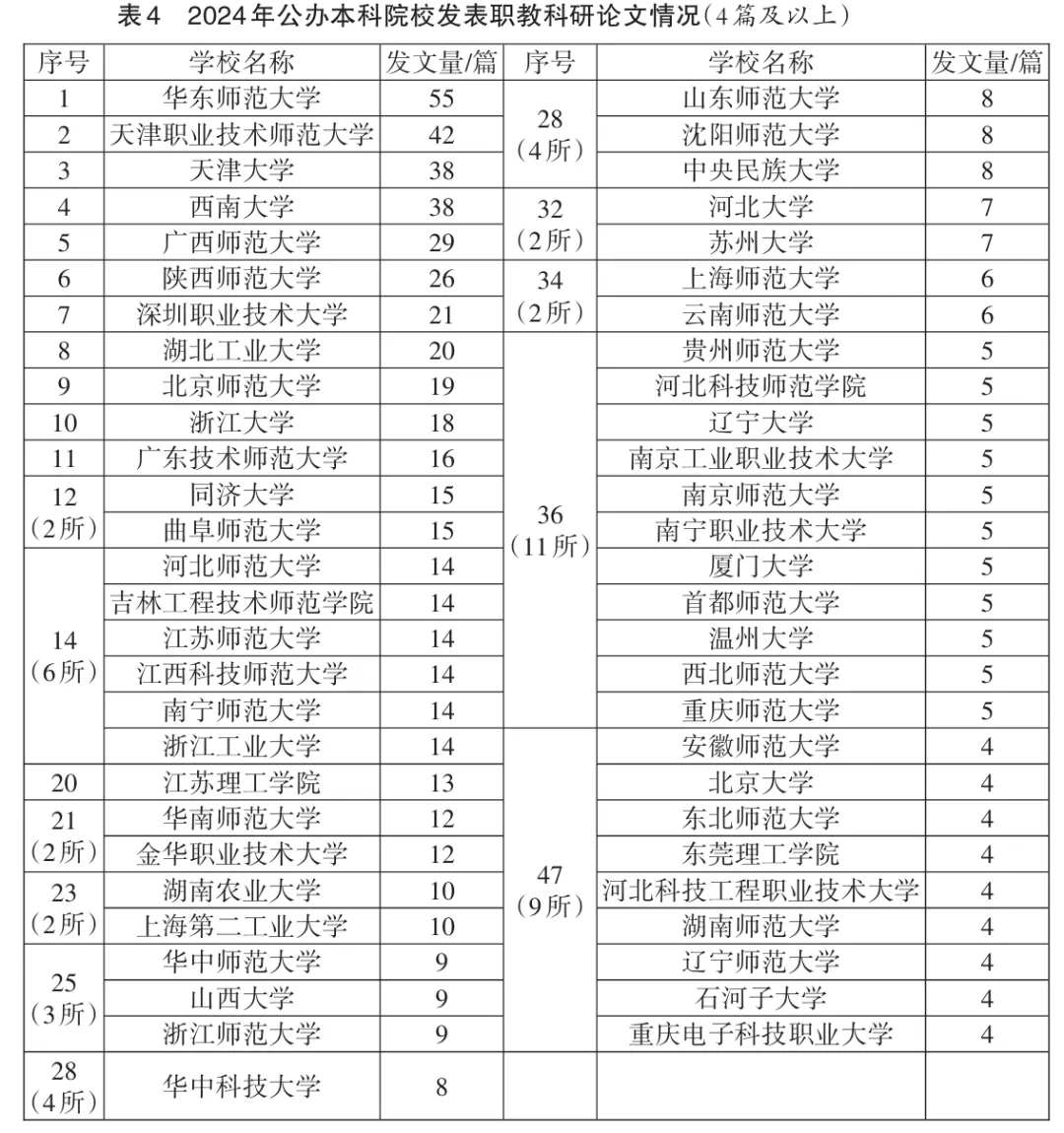 本次职业教育科研论文统计范围为2024年27家教育类中文核心期刊,即《中国职业技术教育》《职教论坛》《职业技术教育》《教育与职业》4家被《中文核心期刊要目总览》收录的职业教育类中文期刊(以下简称“4家职教核心期刊”)的有效论文,以及23家教育类中文核心期刊(以下简称“23家高教核心期刊”)中的职业教育科研论文。