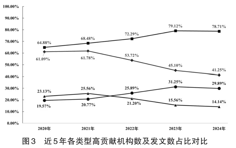 2.高贡献机构占比和发文量占比在公办本科院校和公办高职(专科)学校间存在差异化特点。如图3所示,近5年公办本科高贡献机构占比和发文量占比总体保持增长趋势,而公办高职(专科)学校占比总体上呈下降趋势。这显示了公办本科院校群体内已形成了以职业教育科研为核心集聚的稳定机构,且已成为职业教育学术研究的中心,初步具备了引领性的特点。结合高贡献作者的机构分布情况综合分析,职教科研领域初步形成了学术引领性机构和作者群体,其中公办本科院校占主导的力量。公办高职(专科)学校中,高贡献机构数占比和发文数占比的双下降趋势,一方面与公办高职(专科)学校升本的进程加快相关,另一方面也与公办高职(专科)学校中高贡献机构的规模呈现一定相关关系。