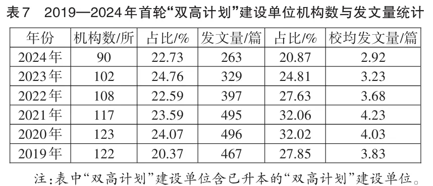 3.“双高计划”建设单位发文情况对比。从职教科研论文的贡献度来看,首轮“双高计划”建设单位总体上发挥了其引领示范作用。如表7所示,2019—2024年发文的首轮“双高计划”建设单位占当年高校发文机构总数的比例、发文量占当年高校发文总量的比例总体上呈现出先上升后下降的趋势,建设的前期上升明显,后期出现下降。校均发文量也呈现出同样的变化趋势。