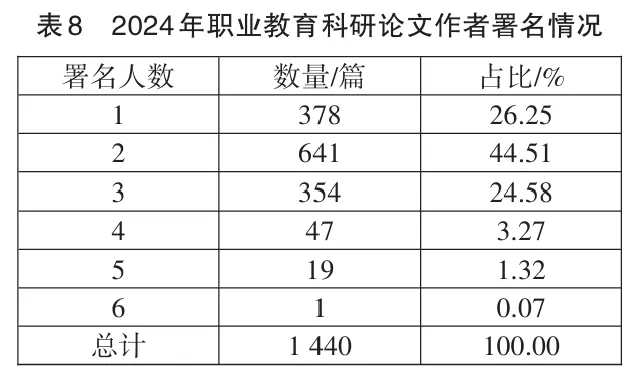 如表8所示,合作署名是主流的研究方式。对比近5年的数据,单独署名占比的持续下降和两人合作署名占比的持续上升构成了职教科研论文署名中的重要现象。单独署名占比分别为43.61%、39.71%、35.88%、29.18%、26.25%,呈现持续下降;两人合作署名占比分别为38.35%、39.27%、41.23%、44.33%、44.51%,持续上升且增速稳定。自2022年两人合作署名超越单独署名成为占比最高的署名方式后,本年度两者的差距再次拉大,两人合作署名与三人联合署名方式合计占比达69.09%,显示出合作研究已成为职业教育科研活动中的主要科研组织方式,职业教育领域的有组织科研逐步形成和壮大。