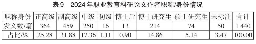 统计范围内的1440篇论文中,有1390篇论文标注了第一作者的职称与身份信息。如表9所示,具有高级职称的第一作者占比57.16%,显示了高级职称群体是职教科研活动的主要贡献力量。相比2023年度,高级职称和中级职称的占比基本持平,博士后和博士研究生的占比均有所提高,分别提高0.51、2.07个百分点。进一步统计发现,在署名身份信息为博士研究生的论文中有123篇显示为在职攻读博士学位,其中有82篇论文的第一作者工作单位为公办高职(专科)学校,2篇论文的第一作者工作单位为中职学校,合计占比68.29%。这从侧面显示出在职业教育高质量发展和职业本科建设热潮之下,职业院校提升师资学历水平的需求与教师自身的努力,以及通过这一方式实现职业院校与本科院校尤其是高水平本科院校之间的科研互动和交流合作。