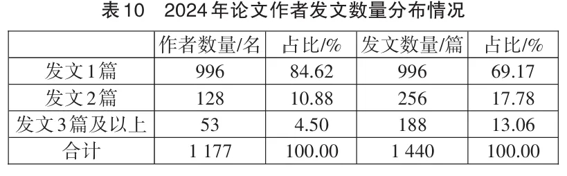 如表10所示,占作者总数4.50%的53位高贡献作者贡献了188篇论文,占比13.06%,相比2023年高贡献作者数占比提升了0.38个百分点,发文量占比上升了0.01个百分点。