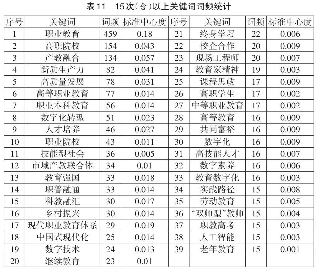 高频关键词是识别某一研究领域的研究重点与热点的重要指示性标识。运用词频统计工具对1440篇论文关键词进行处理和统计分析,共提取6165个关键词,篇均4.28个,其中独立出现的关键词有2987个。对“高等职业教育”“高职教育”、“职业本科”“职业本科教育”等内涵相同的关键词进行相应合并后,继续进行统计分析。在社会网络分析中,一个节点的标准中心度越大就意味着这个节点在网络中就越重要。根据经验法则并参考普赖斯计算公式确定高频词的阈值为15,共计39个关键词,生成共现词对331对并计算出高频词的节点标准中心度。表11列举了重复15次及以上的关键词。