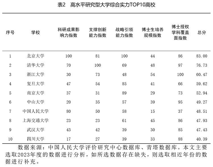 高水平研究型大学综合得分排名前10的高校是北京大学、清华大学、浙江大学、复旦大学、南京大学、中山大学、中国人民大学、上海交通大学、武汉大学、四川大学(见表2)。从各大学在不同维度的表现来看,北京大学以83.00的总分位居榜首,在战略引领能力和科研成果影响力两个维度均获100分,凸显出北京大学在科研领域的卓越实力和持续创新能力。清华大学以76.73分紧随其后,在支撑创新能力表现最佳(100分),凭借高端先进的科研设施和高效协同的创新平台搭建能力,为高难度、突破性科研项目提供了坚实支撑。浙江大学以60.47分的综合得分位列第三,学科覆盖面得分为100分,说明学科门类较为齐全,反映出该校在学科布局的广度和深度方面表现出色,为多学科交叉融合、知识创新与科技突破奠定了良好的基础。需要指出的是,博士培养规模得分最高的是中国科学院大学,这所以科教融合模式为特点的大学源于中国科学院研究生院,2012年更名为中国科学院大学。在招生培养方面,中国科学院博士生招生归口中国科学院大学,但培养过程主要在各下属院所进行,使得学生能够直接参与高水平的科研项目[31]。2023年,中国科学院大学博士生招生人数将近8000人,是位列第二的浙江大学的两倍。