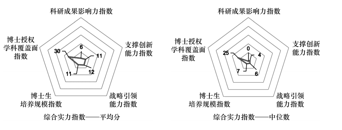 能力两个方面均有出色表现,但大部分重点高校表现一般。与北京大学相比(图2),全国重点大学(平均分)雷达图面积要小得多(图3左)。北京大学的战略引领能力指数、支撑创新能力指数、科研成果影响力指数、博士生培养规模指数、博士授权学科覆盖面指数分别为100分、81分、100分、44分、86分;全国重点大学相应指数的平均分分别为12分、11分、6分、11分、30分,如果用中位数(图3右)则分别为6分、4分、0分、7分、25分,差距更大。这反映出中国重点大学大部分尚不具备高水平研究型大学的特点,建设一批高水平研究型大学是第三轮“双一流”建设的首要任务。