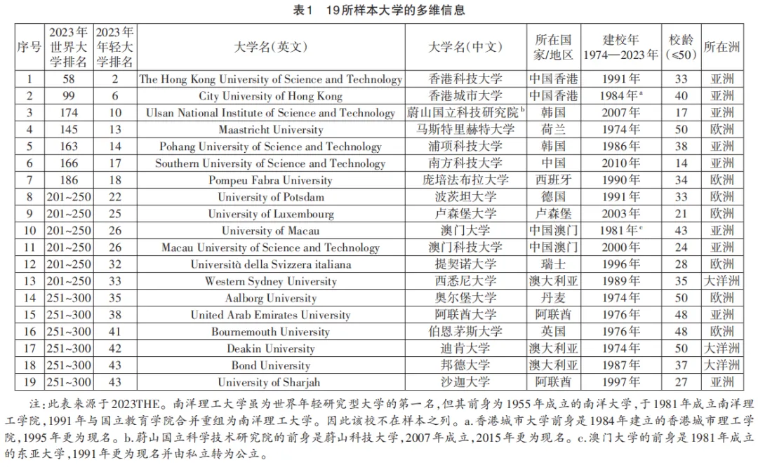 最终,以校龄不长于50年且非重建重组、居2023年the世界大学top300同时居世界年轻研究型大学top50(满足限定的样本自然进入)的19所多科性或综合性大学作为本研究的样本。其多维信息见表1。