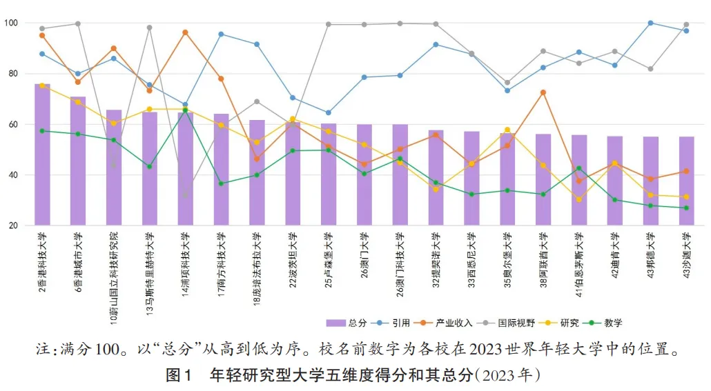 有关研究型大学的概念描述,涉及本研究拟从教学、研究、社会服务的职能维度对年轻研究型大学发展状况及模式进行分析的缘由。由于要借用the“世界年轻研究型大学”的数据库资源,本研究采用其五维度分析框架,即教学(含教学声誉、师生比、博士培养成绩、师均大学收入)、研究(含研究声誉、师均大学研究收入、师均论文数)、引用(论文引用影响力指数fwci)、产业收入(含创新、发明和咨询在内的来自产业和商业的校外收入)和国际视野(含国际教师比、国际学生比、国际合作论文比)。其中的“研究”和“引用”可合成为大学的研究职能,“产业收入”代表大学在履行社会服务职能上的贡献,“国际视野”既表明扩展的大学(国际)社会服务职能,又表明新时代给大学提出的新要求。另外,因the数据库中采用的指标及其权重在2019—2023年间是保持不变的,故本研究采用的是2019—2023年间的数据。