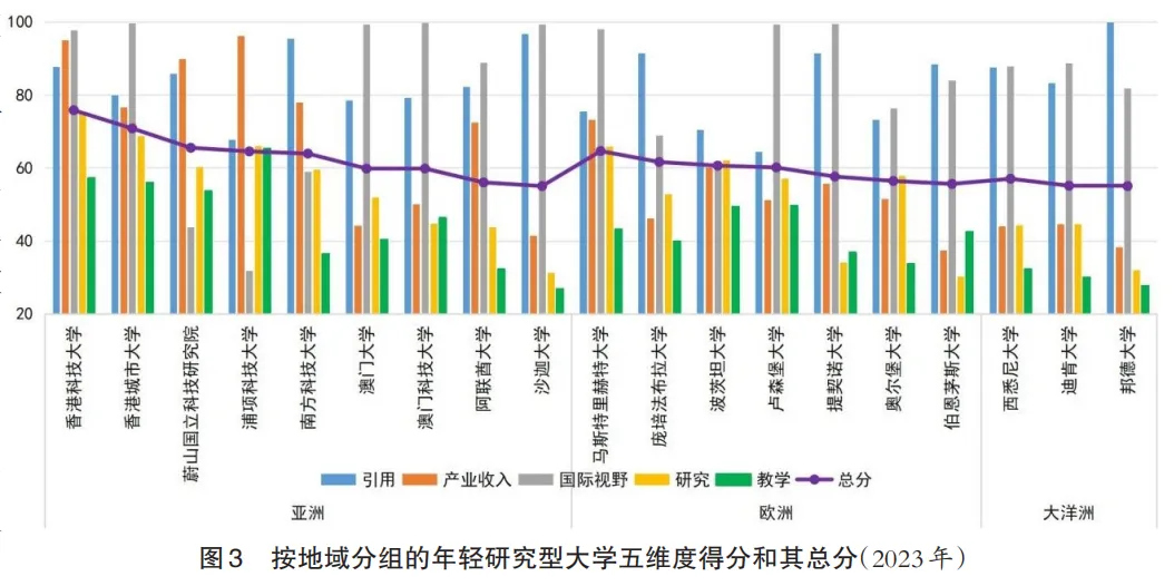 2.地域分布与年轻研究型大学的发展。已知19所样本大学中的9所地处亚洲,7所在欧洲和3所在大洋洲。图3可见按地域分组的样本大学在2023年世界年轻研究型大学中5个分析维度上的得分和总分。