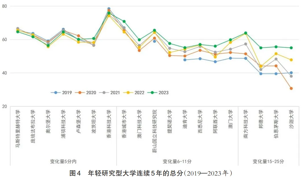 纵向变化指的是在本研究限定的2019—2023年内,19所样本大学发展状况的年度变化。首先要讨论的是各校年度总分变化,再分析参与总分计算的5个维度的得分变化,想了解快速发展的年轻研究型大学是因为哪些方面的优势进入到世界高等教育快速发展视野的。