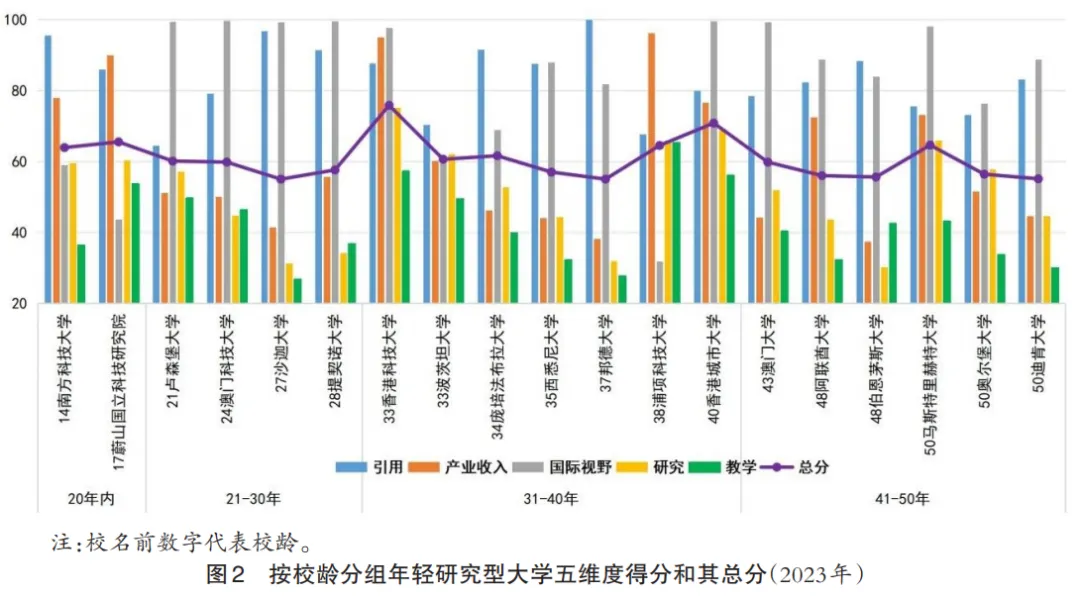 1. 校龄长短与年轻研究型大学的发展。笔者按校龄分组对样本大学进行了研究。(见图2)第一组是校龄不足20岁的南方科技大学和蔚山国立科技研究院,两校在引用和产业收入上的表现都好(比较而言,南方科技大学更注重引用,蔚山国立科技研究院更注重与产业的联系),在研究上的表现相近,在国际视野和教学两个维度上的得分相反(南方科技大学的教学表现不够好,蔚山国立科技研究院在国际视野上的得分较低)。第二组的校龄为21~30岁,组内4所大学的发展重点极为相似:在国际视野上的表现都极好,在引用上的表现都居各自5个维度的第二位,卢森堡大学和澳门科技大学在教学、研究、产业收入三维度上的得分比较均衡,沙迦大学的教学和研究两维度得分都较低。第三组校龄为31~40岁,组内7所大学的发展特点互不相同,主要是在引用、产业收入和国际视野上的表现“各显神通”。除浦项科技大学之外,6所大学的教学得分都为自身5个维度得分中的最低;浦项科技大学在国际视野上得分最低。第四组是41~50岁的“年长组”6校。6校的共同优势在国际视野和论文引用上;阿联酋大学和马斯特里赫特大学的产业收入得分较高而且相近。