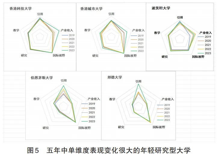 3. 单维度表现变化很大的年轻研究型大学。大学个体在世界大学中的位置依据其总分,而总分是对大学在五维度上的得分的加权总和,所以总分依赖大学在分维度上的表现。大学都有各自的重点工作领域和着力方向,做不到也不必要做到各项工作“齐步走”。经过对19所样本大学连续5年的五维度表现雷达图分析,本研究发现有5所大学的纵向发展主要依赖其在某单一维度上的表现。