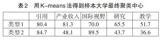 为了增强对前文研究得出的世界年轻研究型大学呈“谷仓形”和“纺锤形”两种发展模式的科学性,本研究采用k-means聚类方法对19所样本大学在论文引用、产业收入、国际视野、研究、教学等5个维度上的表现进行归类,最终得到两组聚类中心,(见表2)分别进入此两个类型的大学与图7所示的呈两种模式的大学相同。k-means法得出的聚类中心本身就清晰地表达了两类大学之间的差异。比较来看,类型1对应着“谷仓形”,呈现这种发展模式的大学在5个分析维度上的表现相对均衡;类型2对应“纺锤形”,呈现这种发展模式的大学具有“高引用、高国际化”的特色。