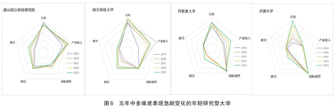 4. 多维度表现急剧变化的年轻研究型大学。兼顾5年纵向变化大和/或雷达图图形独特的情况,4所样本大学在多维度上的表现呈现的是急剧变化,分别是南方科技大学、蔚山国立科技研究院、阿联酋大学和沙迦大学。