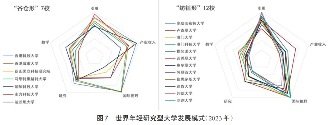 7所大学呈现出“谷仓形”的发展模式:香港科技大学、香港城市大学、蔚山国立科技研究院、马斯特里赫特大学、浦项科技大学、南方科技大学、波茨坦大学。来自亚洲的大学5所和欧洲的大学2所,处在多校龄段,其平均校龄32岁且2所20岁以下校龄的大学都在此组中。该组大学有如下特征:其一,共同的外貌形似“谷仓”,各校在5个分析维度上的表现比较均衡但也并非平均用力,也分轻重;其二,各校的“谷仓顶点”依据该校在5个维度上的表现而定:来自中国香港的2校以“国际视野”、来自韩国的2校以“产业收入”、来自中国的南方科技大学以“引用”分别为各校的“谷仓顶点”,来自欧洲两国的2校的“谷仓顶点”互不相同;其三,“谷仓”有大小之分,香港科技大学的“谷仓”很大而波茨坦大学的“谷仓”很小。总体上看,依据2023年总分数据,排在19所世界年轻研究型样本大学前列(前6名和第8名)的大学都呈现出“谷仓形”发展模式。