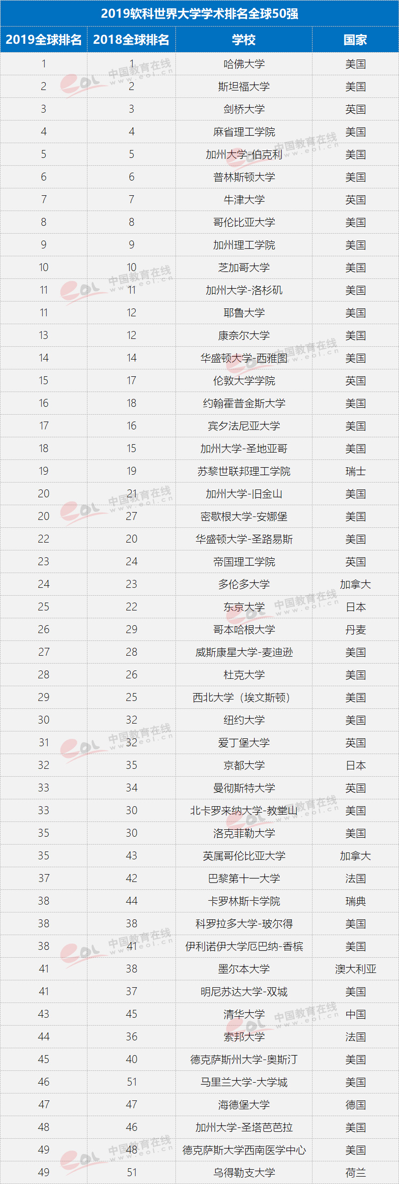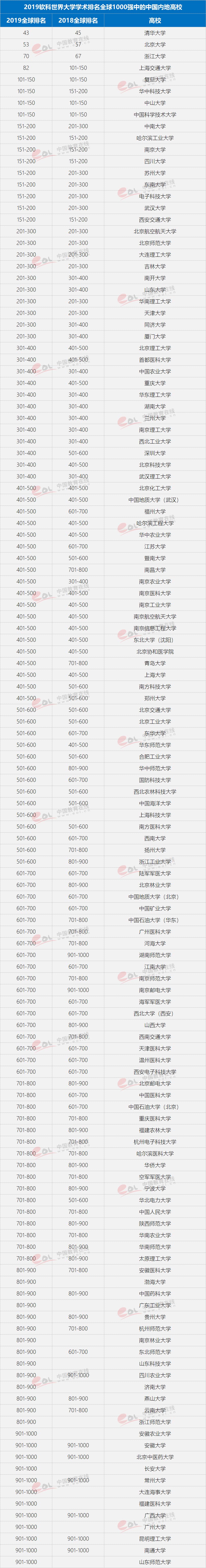 2019软科世界大学学术排名于2019年8月15日18时正式发布。排名展示了全球领先的1000所研究型大学,中国内地共有132所大学上榜,清华大学排名世界第43,北京大学位居世界第53,浙江大学位居世界第70,上海交通大学首次跻身世界百强,位列世界第82。深圳大学、南方科技大学、青岛大学、福州大学、郑州大学、南昌大学、江苏大学、暨南大学8所大学首次跻身世界500强,上海科技大学、广东工业大学等13所大学首次跻身世界1000强,显示了中国大学快速提升的学术水平和国际影响力。