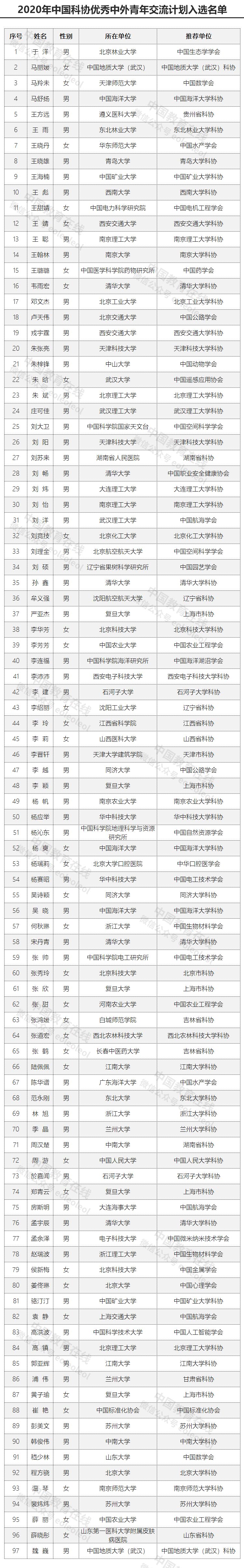 中国科协组织人事部关于公布2020年中国科协优秀中外青年交流计划入选名单的通知