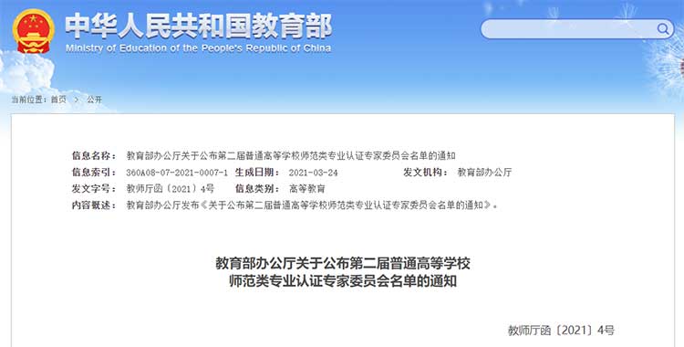 日前,教育部公布第二届普通高等学校师范类专业认证专家委员会名单。本届专家委员会共27人,设主任委员1人、副主任委员4人,任期自本通知印发之日起至2025年12月31日止。秘书处设在教育部高等教育教学评估中心。