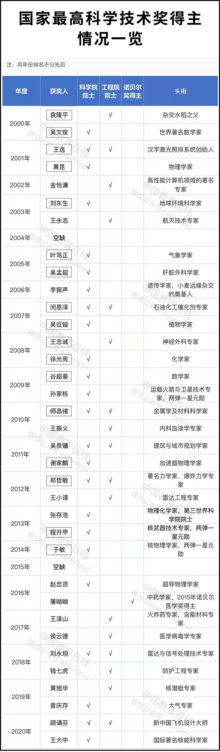 根据国家科学技术奖励工作办公室kok登录官网显示,国家最高科学技术奖每年评选一次,每次授予不超过两名,2004年国家最高科学技术奖第一次出现空缺,2015年第二次出现空缺。截至目前,共有35位杰出科学工作者获得该奖。