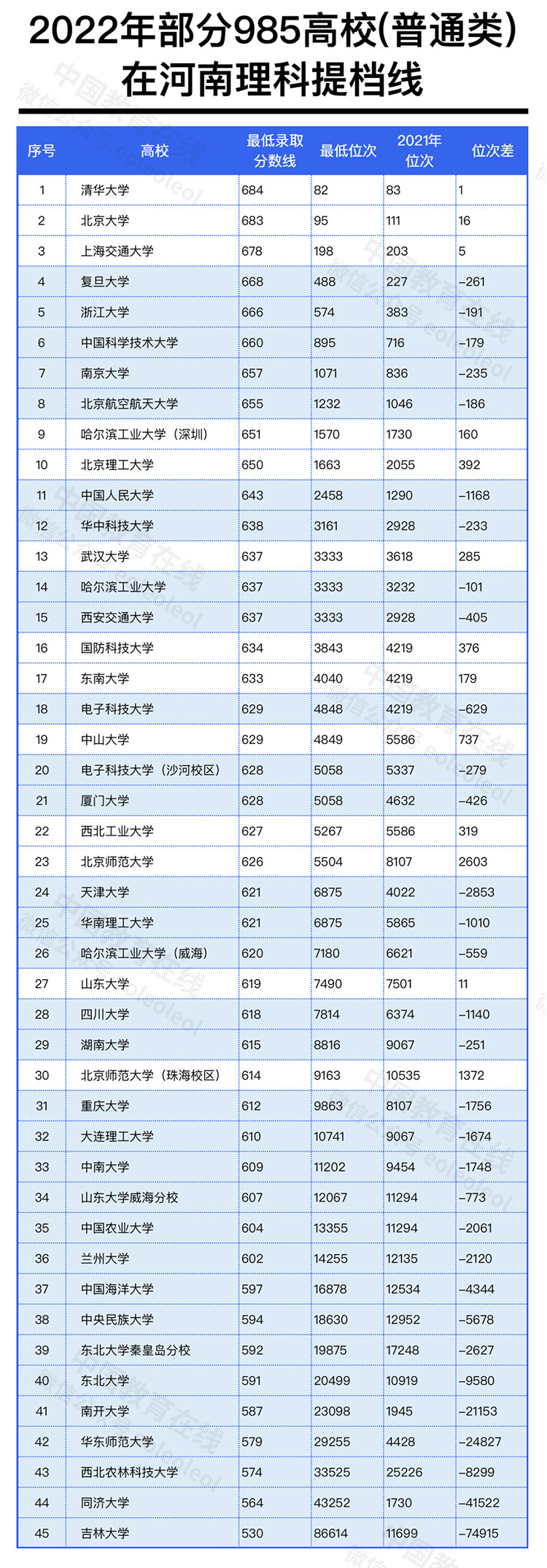 据相关高校公布的录取分数线及位次,老牌985高校同济大学在河南的录取分数线较去年下降大跌103分,从667分下降到564分。位次较去年后移4万多名,下降了41522名。