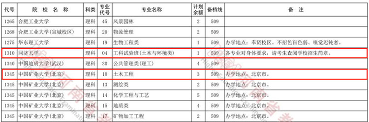根据河南省教育考试院在7月22日发布的通知,本科一批一共有218所院校进行征集志愿。征集志愿的院校名单显示,工科试验班(土木与环境类)是同济大学唯一一个生源不足的专业。与此同时,吉林大学土木类、中国矿业大学(北京)土木工程专业等多所高校的相关专业也出现了计划余额。