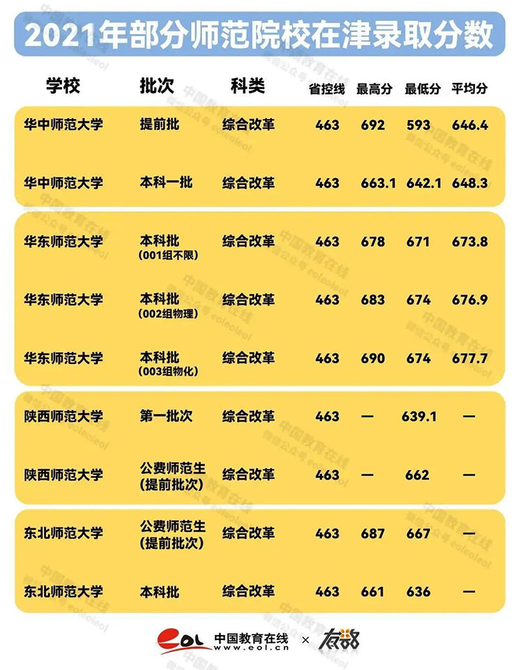 2021年,211高校华中师范大学在天津的录取最高分达692分,只比北大的705分低13分。同样是211高校的东北师范大学分数线也高达687分,与北京大学相差仅18分。