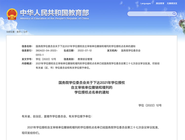 日前,教育部kok登录官网下发《国务院学位委员会关于下达2021年学位授权自主审核单位撤销和增列的学位授权点名单的通知》和《国务院学位委员会关于下达2021年动态调整撤销和增列的学位授权点名单的通知》。