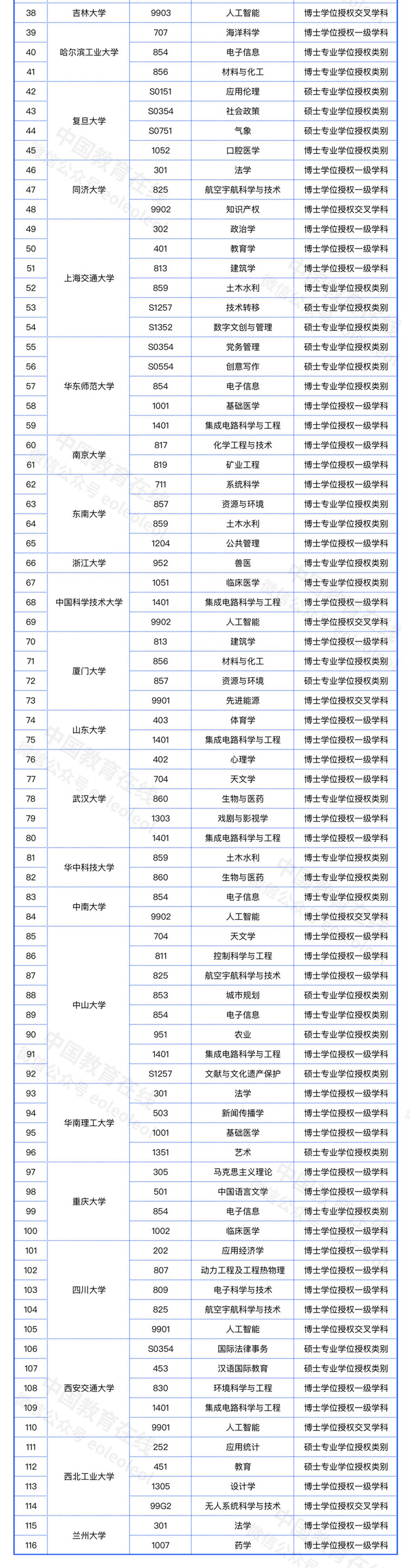 其中,中山大学共增列8个学位授权点,数量最多;天津大学共增列3个博士点、4个硕士点,位居第二;上海交通大学则共增列6个授权点,紧随其后。