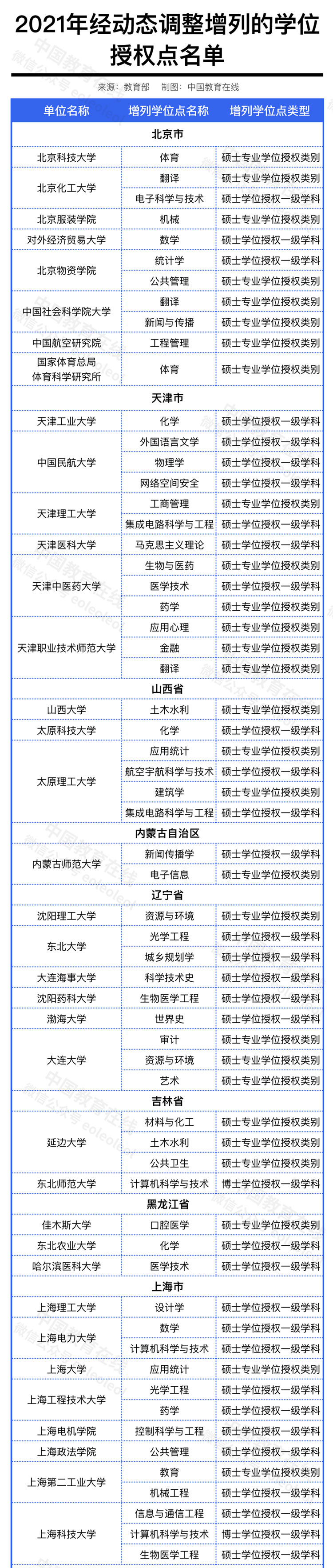 2021年经动态调整增列的学位授权点名单