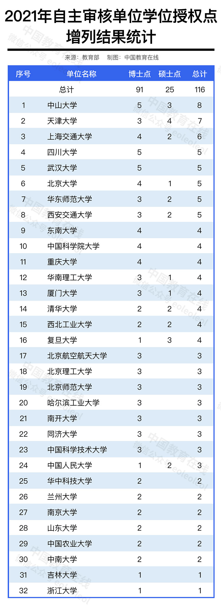 据统计,2021年,全国32家学位授权自主审核单位共撤销学位授权点3个,增列学位授权点116个,其中增列博士学位授权点91个,含博士学位授权交叉学科17个。