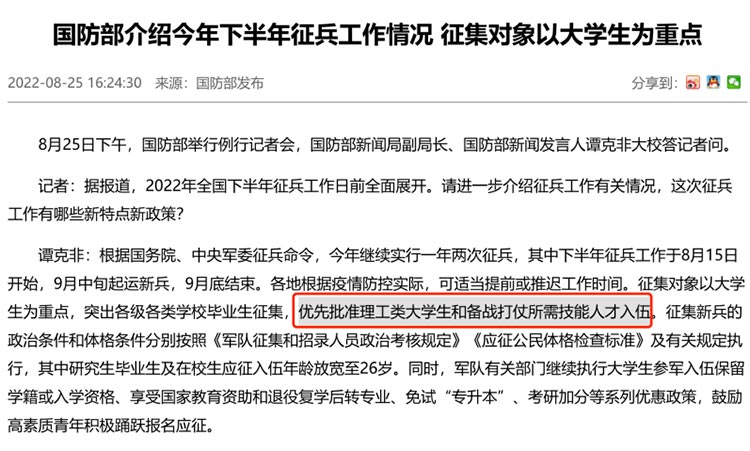 征兵理工科优先!8月25日,国防部公布今年9月征兵对象:以大学生为重点,优先批准理工类大学生和备战打仗所需技能人才入伍。