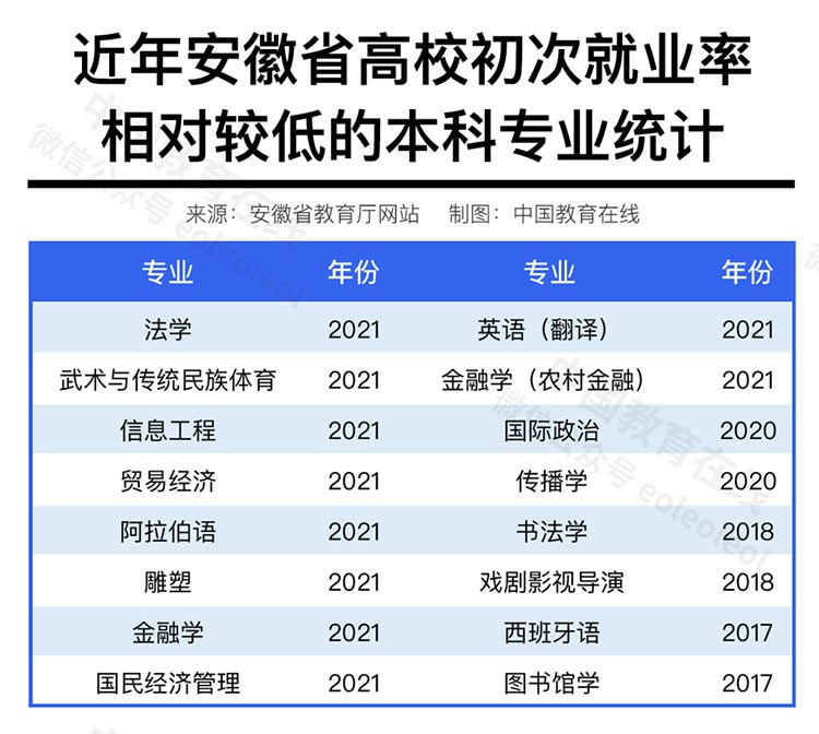 哪些专业可能因就业落实率表现不佳成“高危”专业?《安徽普通高校本科专业布局和需求分析报告(2021年)》显示,这些“亮红灯”的专业初次就业率分别为:法学58.89%、武术与民族传统体育56.06%、信息工程54.00%、贸易经济50.79%、阿拉伯语50.00%、雕塑50.00%、金融学(国际金融)47.46%、国民经济管理44.19%、英语(翻译)33.33%、金融学(农村金融)0.00%。