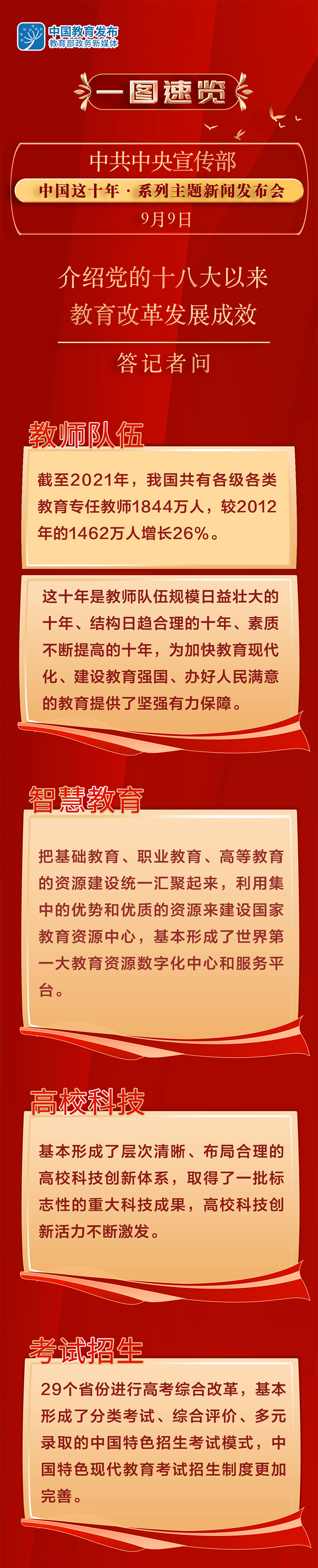 9月9日,中共中央宣传部举行“中国这十年”系列主题新闻发布会,教育部部长怀进鹏出席发布会,介绍党的十八大以来教育改革发展成效有关情况,并答记者问。